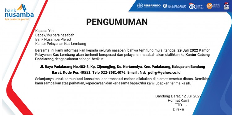 13 Jul Pengumuman Pemberhentian Pelayanan Operasional Kantor Kas Lembang Kepada Yth Bapak/Ibu para nasabah Bank Nusamba Plered Kantor Pelayanan Kas Lembang ... Berita Cabang